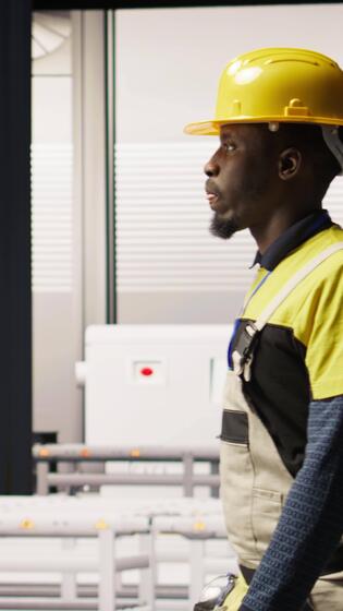 Vertical Man walking in industry 4.0 plant, taking note of modifications to make, providing technical support. Smart factory serviceman adding IoT sensors monitoring energy consumption, camera A Pro Video