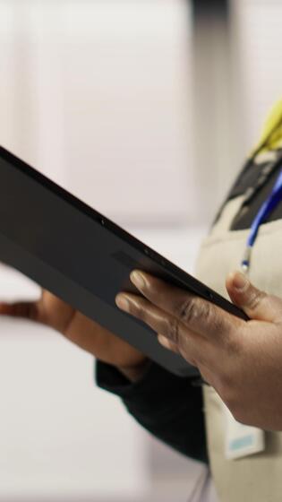 Vertical Engineer in smart factory oversees robotic assembly lines using tablet app, ensuring quality control during manufacturing. Worker monitoring automated conveyor systems using device, camera B close up Pro Video