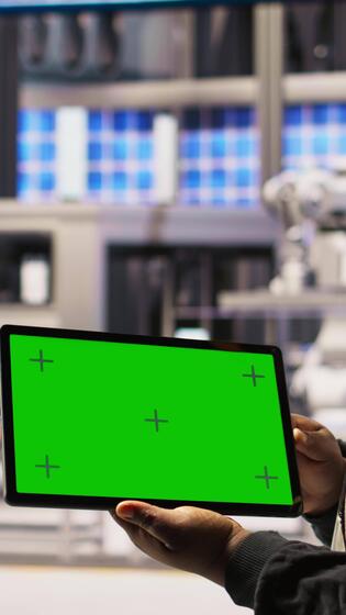 Vertical Smart factory specialist using green screen tablet to test automated systems to ensure reliability. Industry 4.0 plant technician using chroma key device to identify bottlenecks and optimize, camera A Pro Video