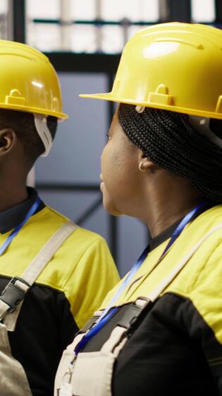 Vertical Smart factory manager overseeing work done by engineer calibrating high tech machinery and analyzing sensor data. Team leader supervising engineer troubleshooting assembly equipment, camera B Pro Video