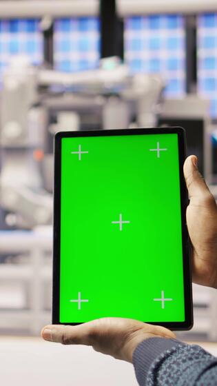 Vertical Smart factory expert uses green screen tablet to implement automated workflows. Industry 4.0 plant technician integrates sensors into production using chroma key device, camera A close up Pro Video
