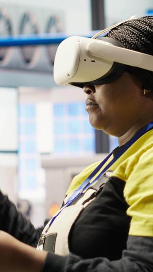 Vertical Photovoltaics smart factory specialist fixing damaged IoT sensors using VR tech. Mechanic in industry 4.0 solar panels plant using innovative virtual reality tech to find and fix errors, camera B Pro Video