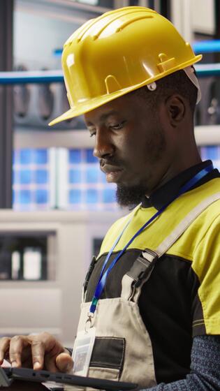 Vertical Industry 4.0 plant engineer following maintenance procedures to mend bugs. Smart factory professional analyzing data on laptop to predict production lines and robotic arms failures, camera A Pro Video