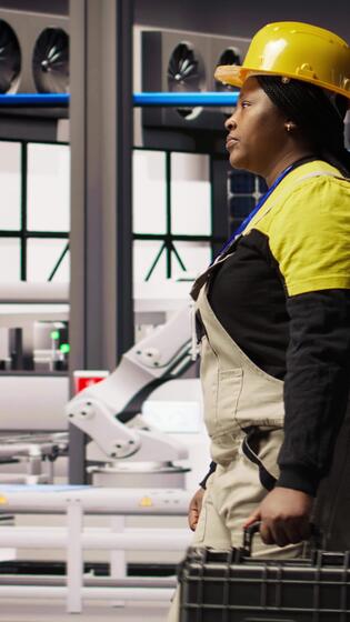 Vertical Smart factory mechanic installing automated workflows control systems, computerizing operations. Repairman walking in industry 4.0 plant with toolbox, integrating sensors into production, camera A Pro Video