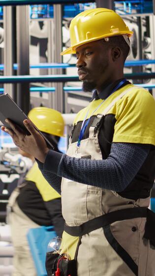 Vertical Industrial plant technician using tablet to implement green energy solutions, integrating solar tech in assembly systems. Smart factory worker enhancing production efficiency using device, camera A Pro Video