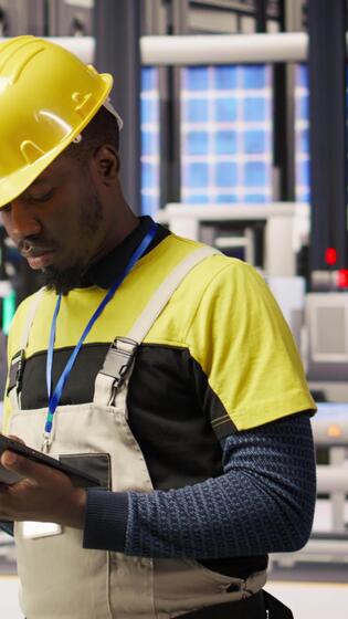 Vertical Technician in solar panels factory does maintenance using tablet, analyzing IoT sensor data. Industry 4.0 plant expert managing operational reliability of photovoltaic systems using device, camera A Pro Video
