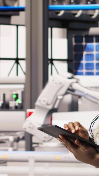 Vertical Smart manufacturing factory engineer using tablet app to calibrate high tech machinery and analyze sensor data. Engineer using digital device to troubleshoot photovoltaic assembly equipment, camera A Pro Video