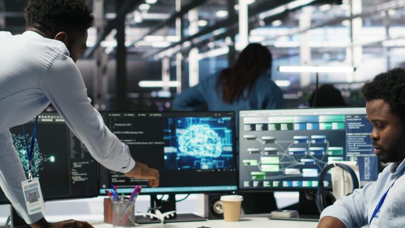 Technician in wheelchair and data center manager using AI node tree software to minimize system downtime. Server hub employee in disability and team leader using visual programming tool, camera B Pro Video