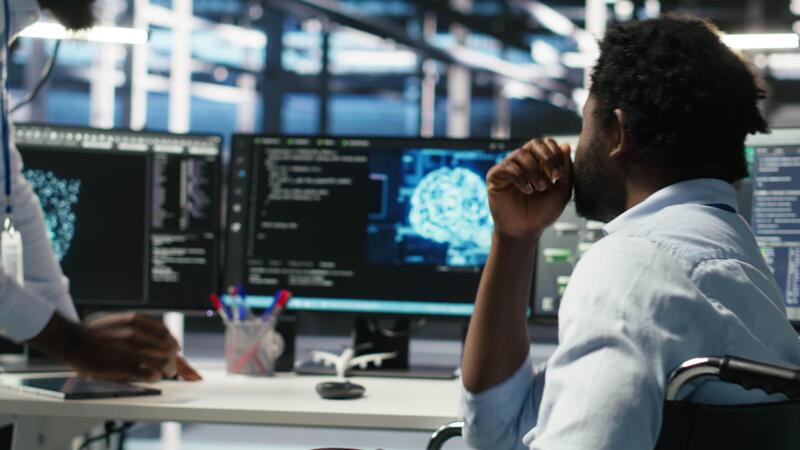 Server farm supervisor and man with disability adjust system settings based on AI analytics. Data center manager talking with technician in wheelchair overseeing automated node tree tool, camera B Pro Video