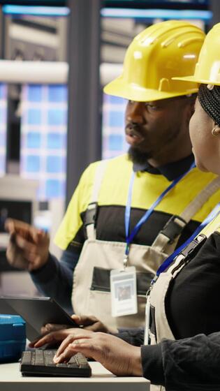 Vertical Engineering team using PC in smart factory to oversee robotic assembly lines, ensuring quality control during manufacturing. Teamworking colleagues monitor automated conveyor belts, camera B Pro Video