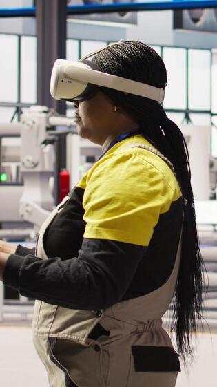 Vertical Photovoltaics smart factory specialist fixing damaged IoT sensors using VR tech. Mechanic in industry 4.0 solar panels plant using innovative virtual reality tech to find and fix errors, camera A Pro Video