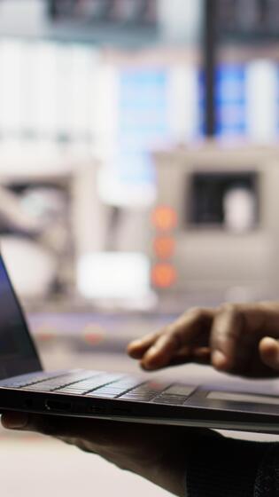 Vertical Industrial plant engineer implementing renewable energy solutions, integrating solar technology in automated assembly systems. Smart factory employee enhancing production efficiency, camera A close up Pro Video