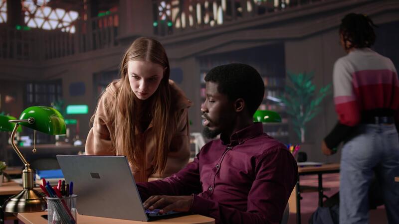 Multiethnic pupils working on team project assignment at campus library, consulting academic database and research collection with various books. Young adults guarantee high grades. Camera B. Pro Video