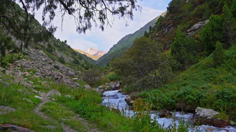 Handheld static view of a mountain valley with a winding stream, green hills, and scattered trees. Overcast sky, rocky terrain, no movement, natural setting. Pro Video