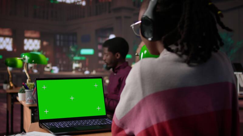 Young student uses mockup display while doing research for exam preparations, reading educational information from reliable academic sources. Pupil completes her notes in the textbook. Camera B. Pro Video