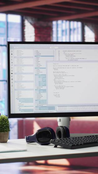 Vertical Empty desktop monitor used for software development and coding in a luxurious loft apartment. Modern workstation or in a stylish studio supports tech performance and big data systems. Pro Video