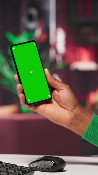 Vertical Black guy interacting with intelligent AI chatbot on pc next to copy space screen, using smart innovative system. Machine learning enhances efficiency through advanced algorithms. Camera A. Pro Video