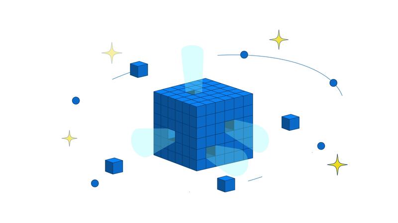 Digital data cube with orbiting blocks and sparkles 2D cartoon object animation. High tech futuristic technology model. Geometric structure animated flat colorful item 4K isolated on white Pro Video