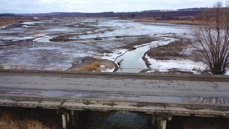 Gloomy scene of nature. Polluted river floating under the bridge on muddy background in springtime. Ecological problems. View from above. Pro Video