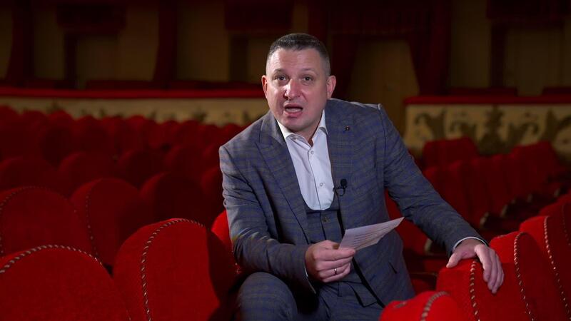 Actor at rehearsal in auditorium. Man repeating monologue while sitting among red chairs in the empty hall. Speaker rehearsing before the performance. Pro Video
