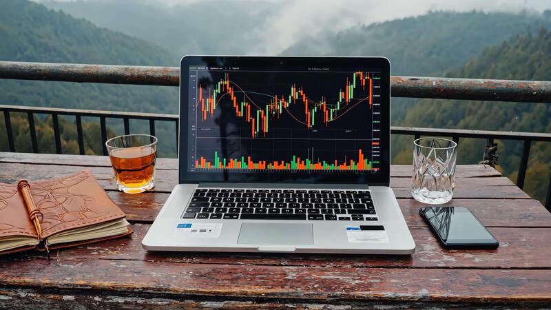 Laptop computer displaying stock market chart, whiskey glass, and smartphone on wooden table with notebook, set against a mountain view, remote work, online trading and financial Pro Video