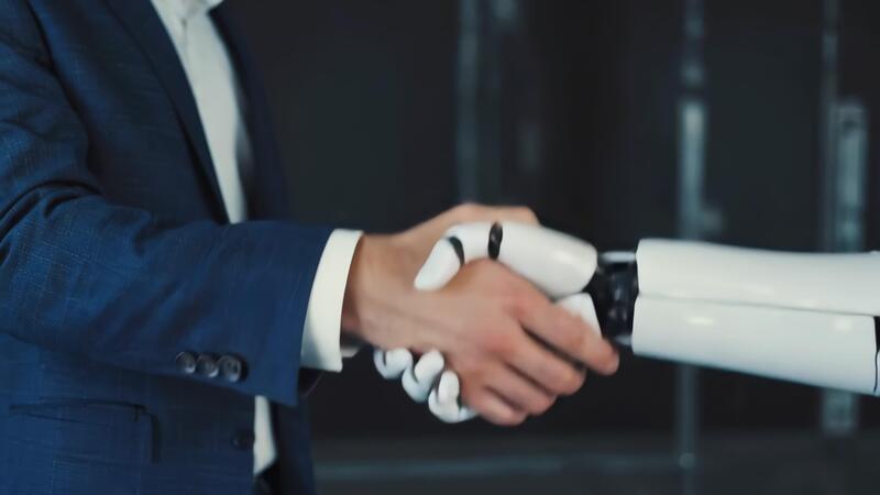 Businessman in blue suit shaking hands with humanoid robot in a modern tech setting, symbolizing cooperation, artificial intelligence, futuristic and partnership between humans and Pro Video