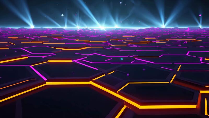 Futuristic digital landscape with glowing neon hexagons and light beams in a cyberpunk inspired environment, abstract technology, digital world, virtual reality, and data driven concept Pro Video