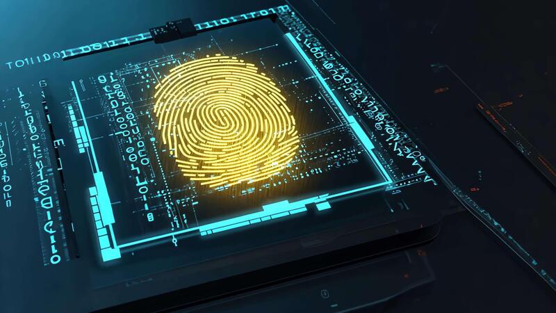 Glowing yellow fingerprint displayed on high tech digital interface with binary code representing secure biometric authentication, identity verification, cybersecurity, and futuristic Pro Video