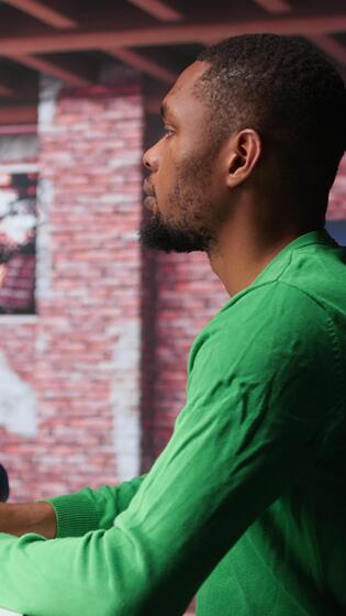 Vertical Black graphic designer working in loft with AI image generator software. Digital screen displaying visuals created through machine learning and cloud computing, . Camera B. Pro Video