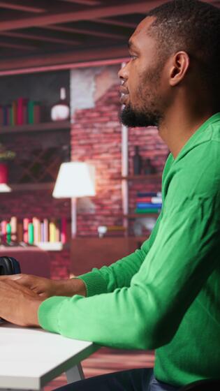 Vertical Black guy using text to image AI chat software at his modern loft. Digital screen shows generative content via neural networks, enhancing predictive models and visualized data. Camera B. Pro Video