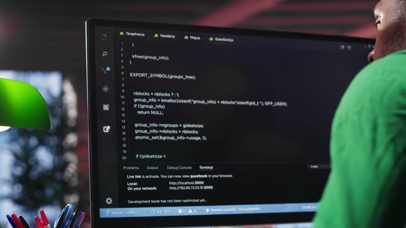 Black system administrator creating a software with programming language. Professional engineer focuses on app development, debugging, encryption and security at home. Camera A. Pro Video