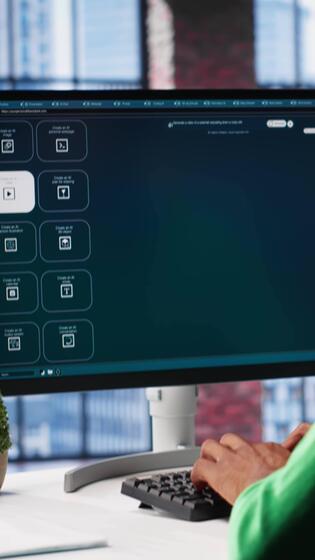 Vertical Computer screen displays digital visuals generated through AI. Young person uses software combining data and machine learning, text prompts to design graphics at home office. Camera A. Pro Video