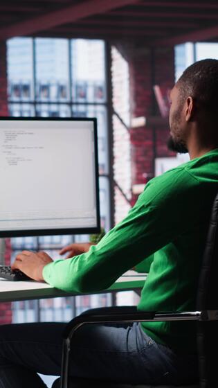 Vertical African American IT expert working with a computer full of code. Professional system engineer focuses on software development, debugging, encryption and system security at home. Camera A. Pro Video