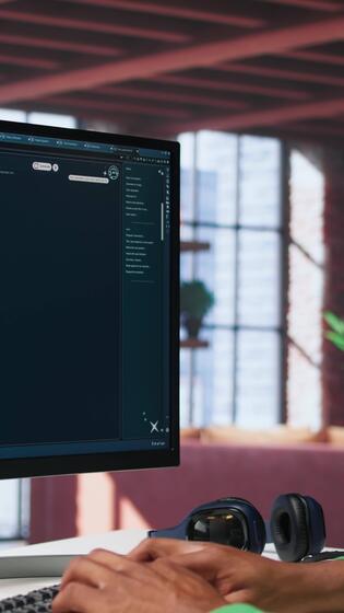 Vertical African american user operates program to create digital photos in modern loft. Man explores creative visualization with artificial intelligence tools, with prompts. Camera B. Pro Video