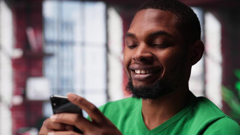 Man taking break from work to check his social media apps on mobile phone, having fun relaxing at home. Young guy in loft pausing tasks to use social network application on phone. Camera A. Pro Video