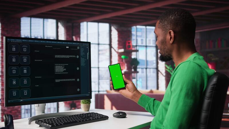 Black guy interacting with intelligent AI chatbot on pc next to copy space screen, using smart innovative system. Machine learning enhances efficiency through advanced algorithms. Camera B. Pro Video