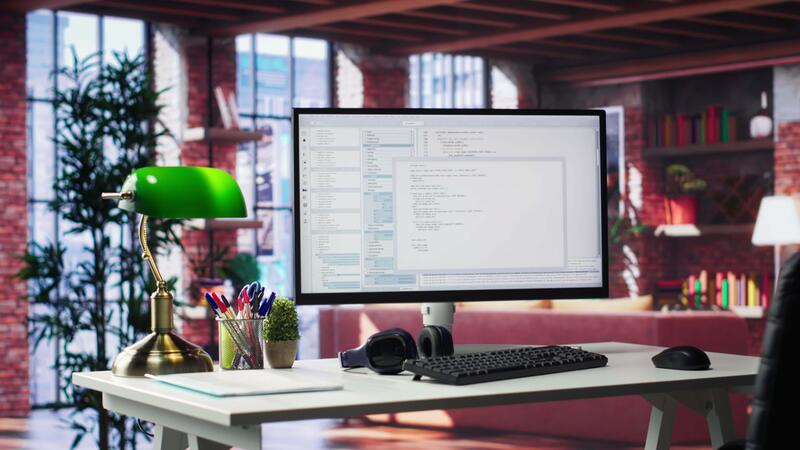 Empty desktop monitor used for software development and coding in a luxurious loft apartment. Modern workstation or in a stylish studio supports tech performance and big data systems. Pro Video