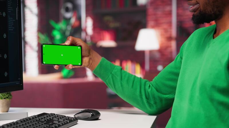 African american man engaging with AI chatbot next to chroma key, using the virtual assistant with prompts for data driven algorithms to enhance productivity at home office. Camera A. Pro Video