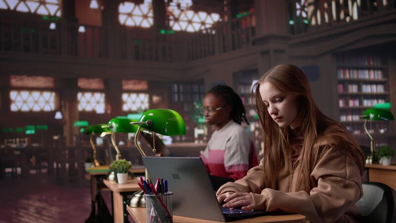 College student captivated by literature assignment at the academic library on campus, working on bachelor degree paperwork. Uses primary source materials from the database. Camera B. Pro Video
