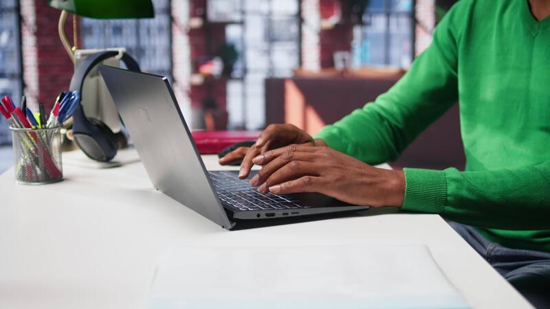 Freelancer creating articles content for his online blog at home desk, writing and working on storytelling with his laptop. Black guy composes social media posts, multitasking. Camera B. Pro Video