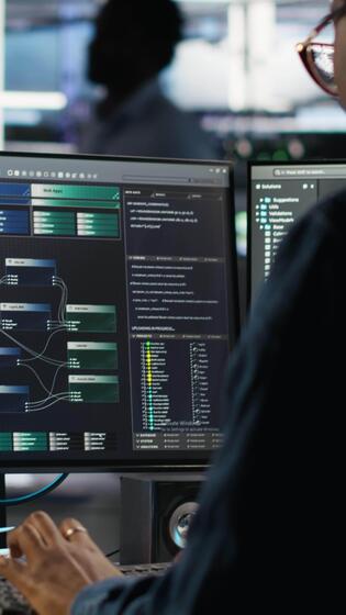 Vertical Angry server farm engineer frustrated by node tree systems unable to categorize unstructured data. Mad data center worker punching desk, annoyed by bugged visual programming software, camera B Pro Video