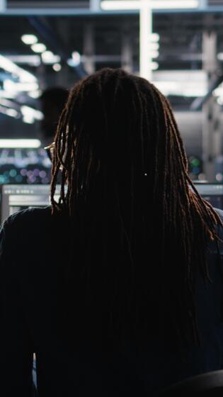 Vertical Angry server farm engineer frustrated by node tree systems unable to categorize unstructured data. Mad data center worker punching desk, annoyed by bugged visual programming software, camera A Pro Video