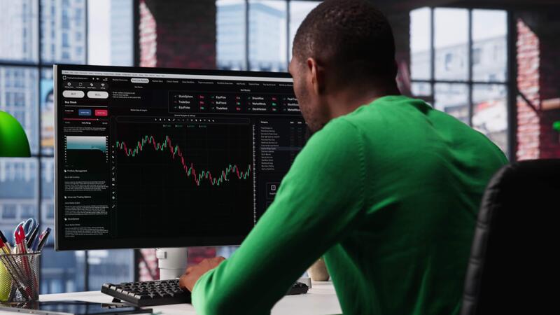 Day trader uses computer to purchase stocks that might perform well and selling ones that might drop in value. Forex trader browsing though stock exchange portfolio pages at PC desk. Camera A. Pro Video