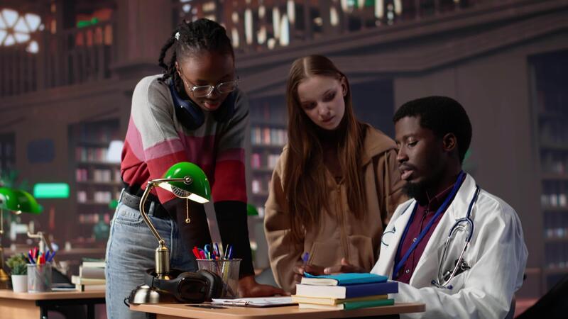 Diverse group of pupils in a library discuss with a medic resident, preparing for a new lecture at med school. Using medical books and materials to gain expertise in microbiology. Camera A. Pro Video