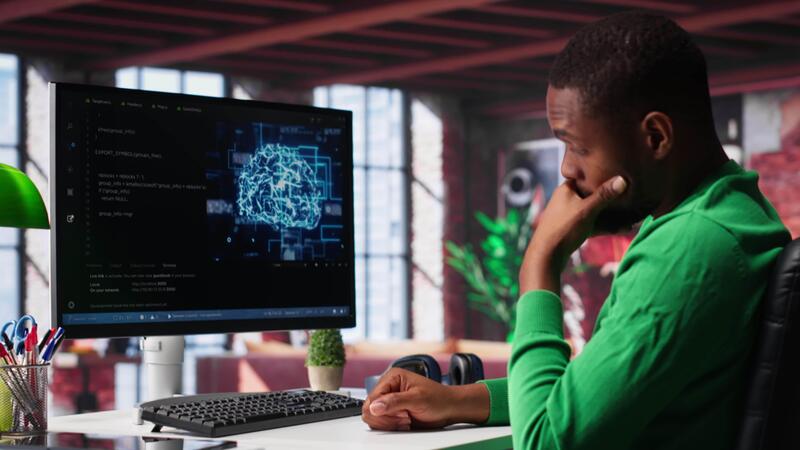African american engineer coding a neural network AI brain model for machine learning and deep learning, solving IT support tasks on pc. Debugging software and checking for errors. Camera A. Pro Video