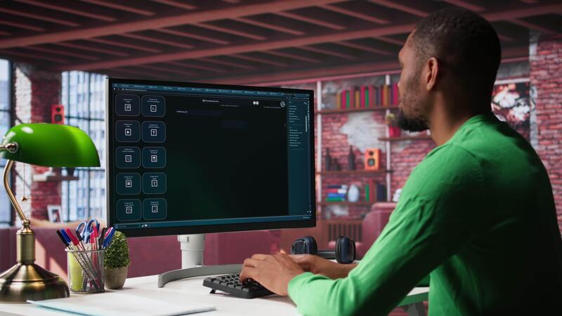 African american guy uses artificial intelligence chatbot trained to understand and generate information, data prompt for virtual generative technology. User talks with AI powered chat. Camera B. Pro Video