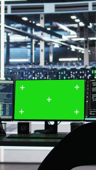 Vertical Chroma key computer displays in data center workplace used for managing supercomputers hardware energy consumption. Green screen PC used for automation in server hub workplace Pro Video