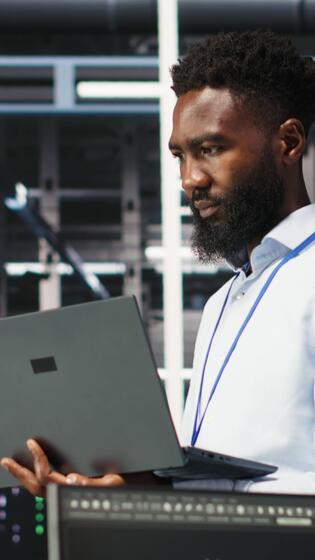 Vertical Data center system administrator analyzing infrastructure issues using node tree tools. Man in server hub using AI visualization insights on laptop to optimize system health, camera B Pro Video