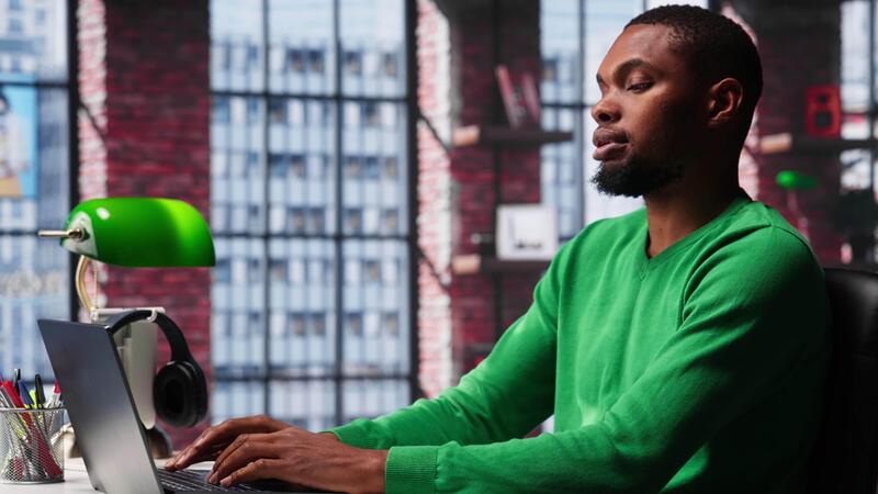 African american male teleworker completing spreadsheets on laptop, entering numerical data into cells and calculating totals. Guy using spreadsheet software functions. Camera A. Pro Video
