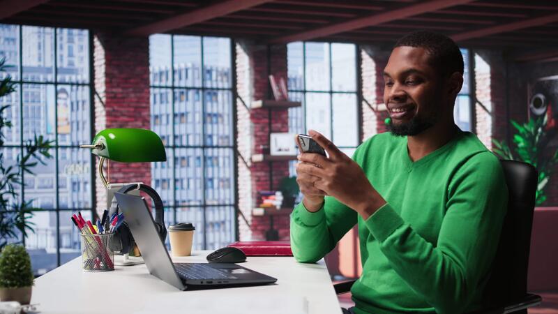 Man taking break from work to check his social media apps on mobile phone, having fun relaxing at home. Young guy in loft pausing tasks to use social network application on phone. Camera B. Pro Video